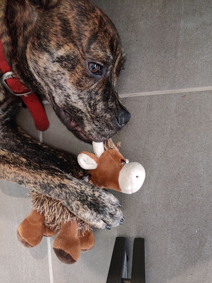 Dougie loves to play, although the concept of fetch is still fairly new.