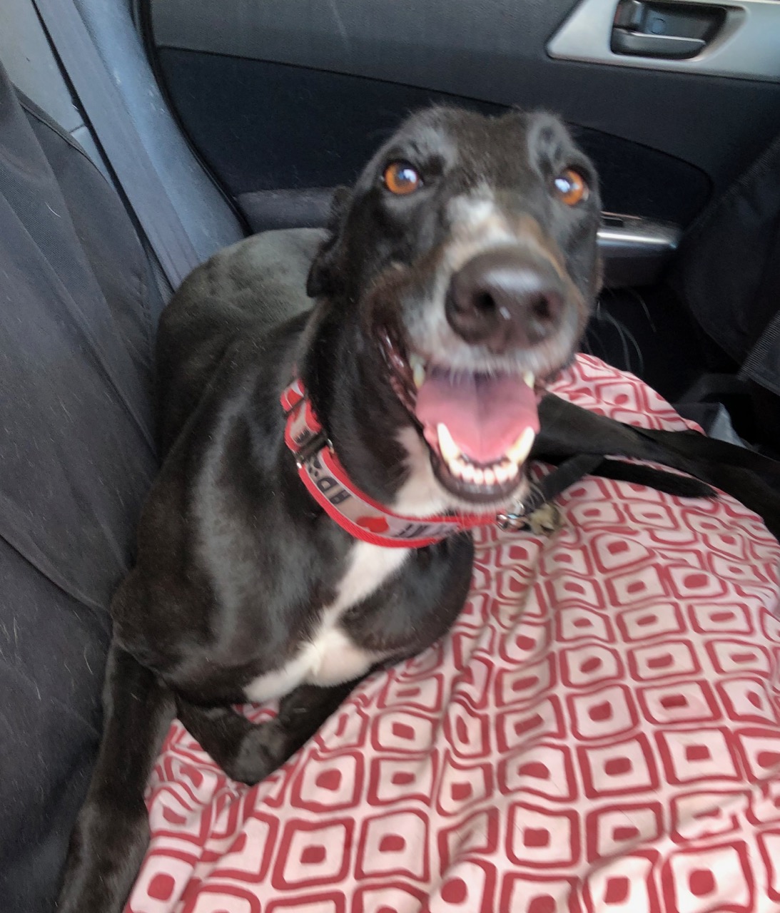 Gentle Jasmine is a bit of a lounger. After her walks, she’s quite happy to spend the rest of the day hanging in bed and getting pats. She loves people, is very calm, has an inquisitive nature and loves to observe her humans from the comfort of her bed.