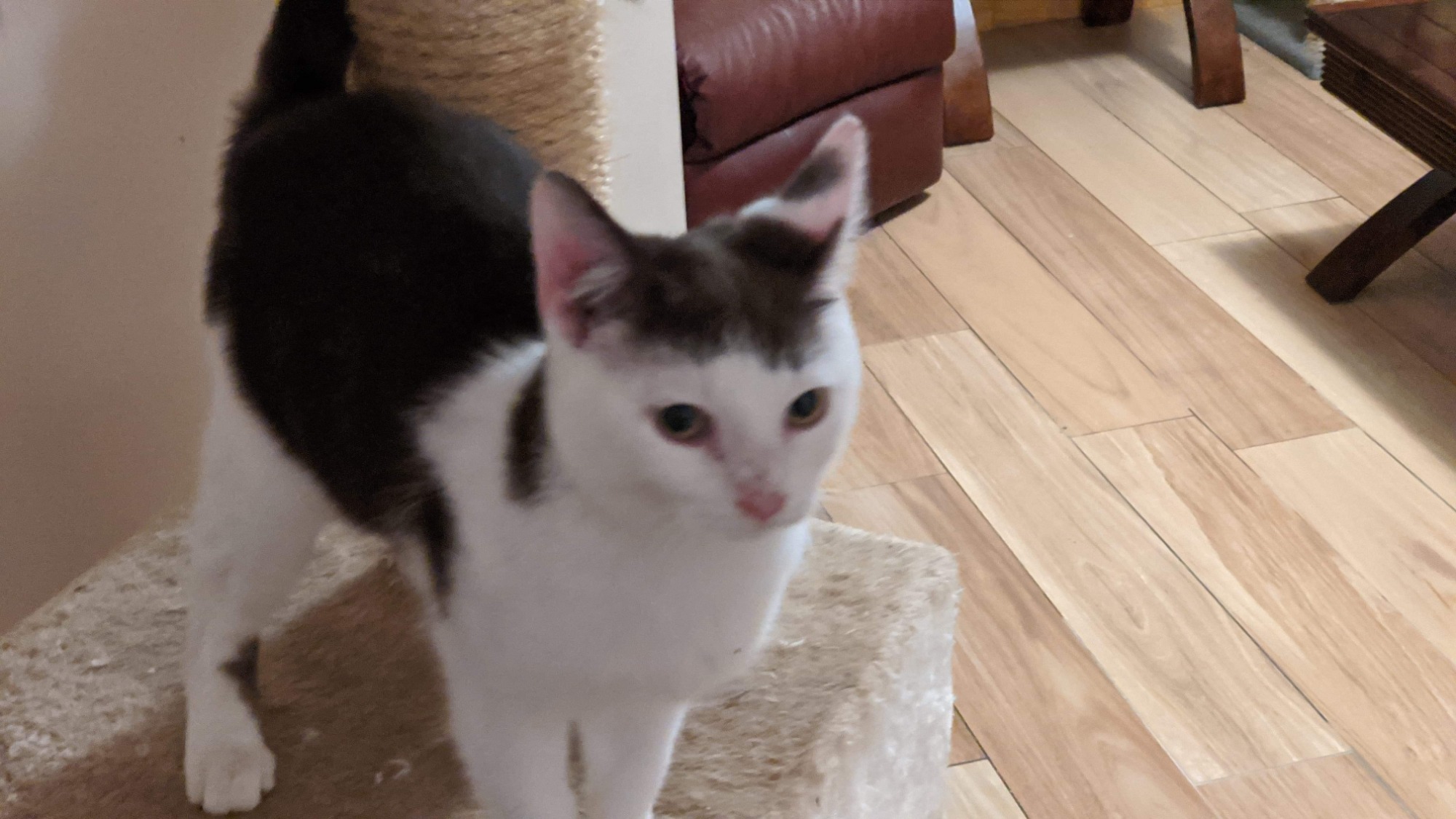 River can be a bit standoffish initially, but when he warms up to you, he is a playful , cheeky boy full of purrs!
