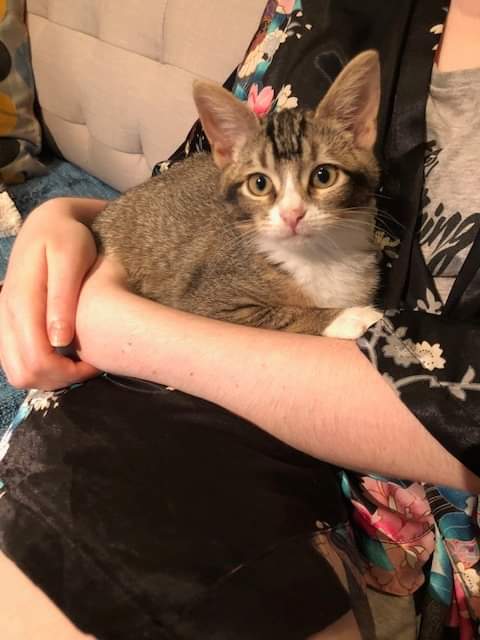 Sage is around 12 weeks old and as cute as a button. Initially a little shy when she arrived at her foster home, she has blossomed in care. She loves playing with toys and enjoys a game of hide and seek with her kitty foster buddy. After all that tiring work she is happy to seek out a lap for a snuggle, and loves pats and chin scratches.