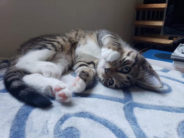 Numbat is a wonderful, curious and affectionate kitten. She has made amazing progress in care and has really come out of her shell. Numbat loves to play and has boundless energy for chasing games and toys. She also has the loudest purr ready for snuggle times with people. Numbat is also social with other cats, people and small dogs.