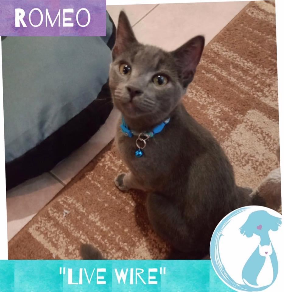 There is no other way to describe Romeo than to say he is a live wire. He is as non stop full of energy and enthusiasm for mischief as any kitten his foster mum has ever fostered.