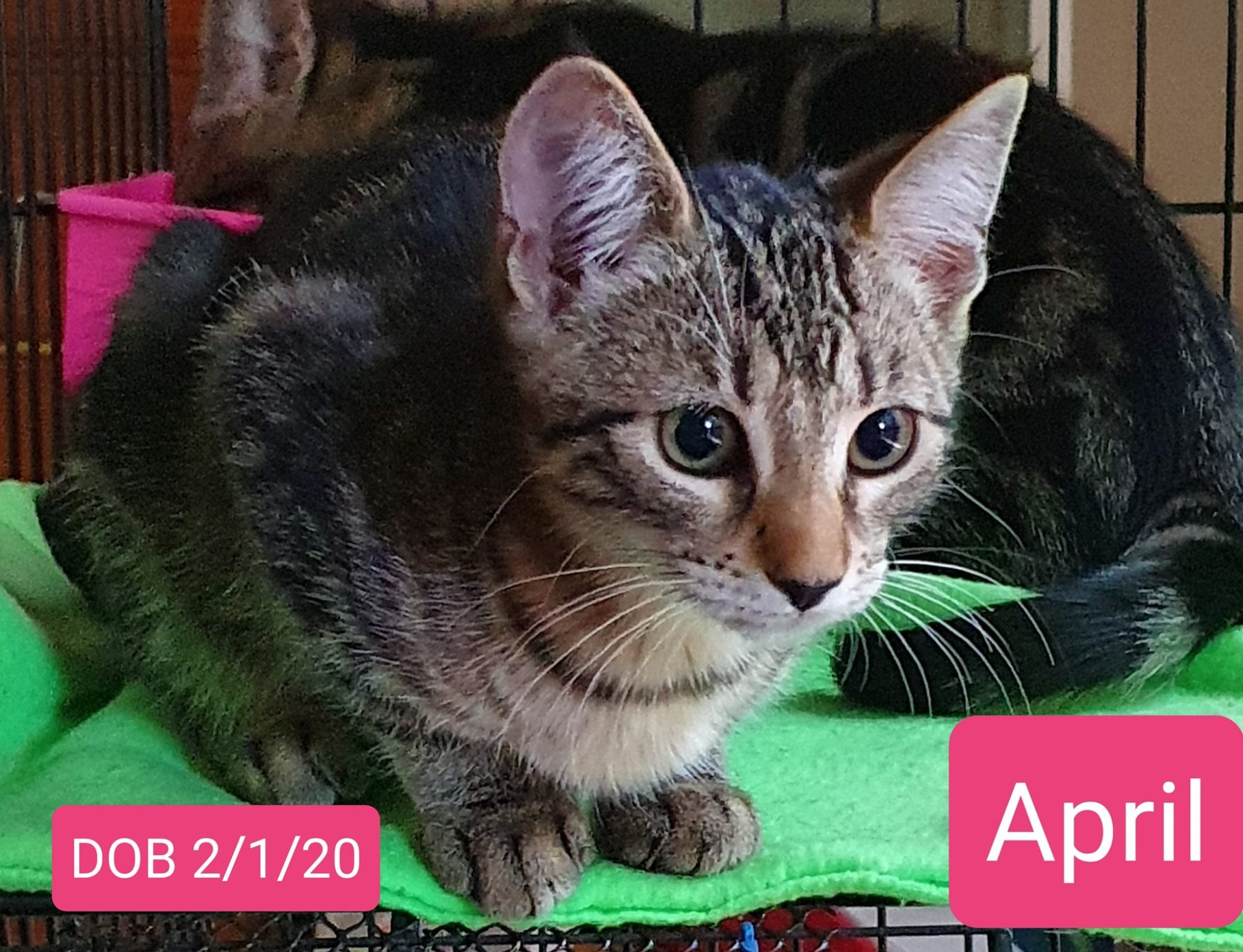 Dear April our tabby girl is ready to start looking for her home. April is an affectionate and playful kitten that gets a purr up as soon as you pick her up.