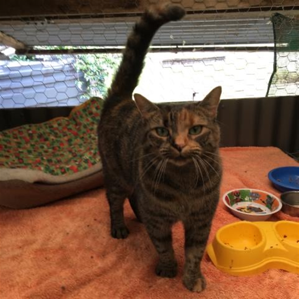 PHOEBE #127C is a two and a half year old desexed female tortie tabby cat. She is extremely cute and affectionate, is confident with people after an initial few days, but is absolutely terrified of other cats. She has lived in a large cattery setting on acreage, where she has had freedom to be outdoors for a few hours on most days. She has always come back promptly when called which indicates she is not a wanderer, and she loves to hang around her carer in the garden and around the property generally.