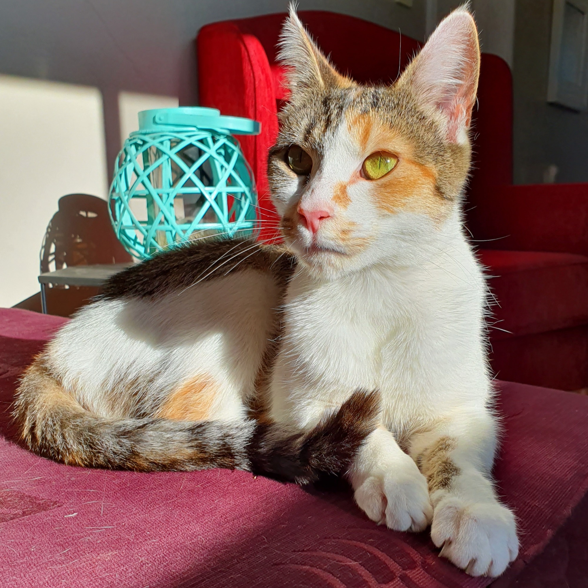 She is very gentle, and happy to join you quietly in a sunny spot and keep you company.