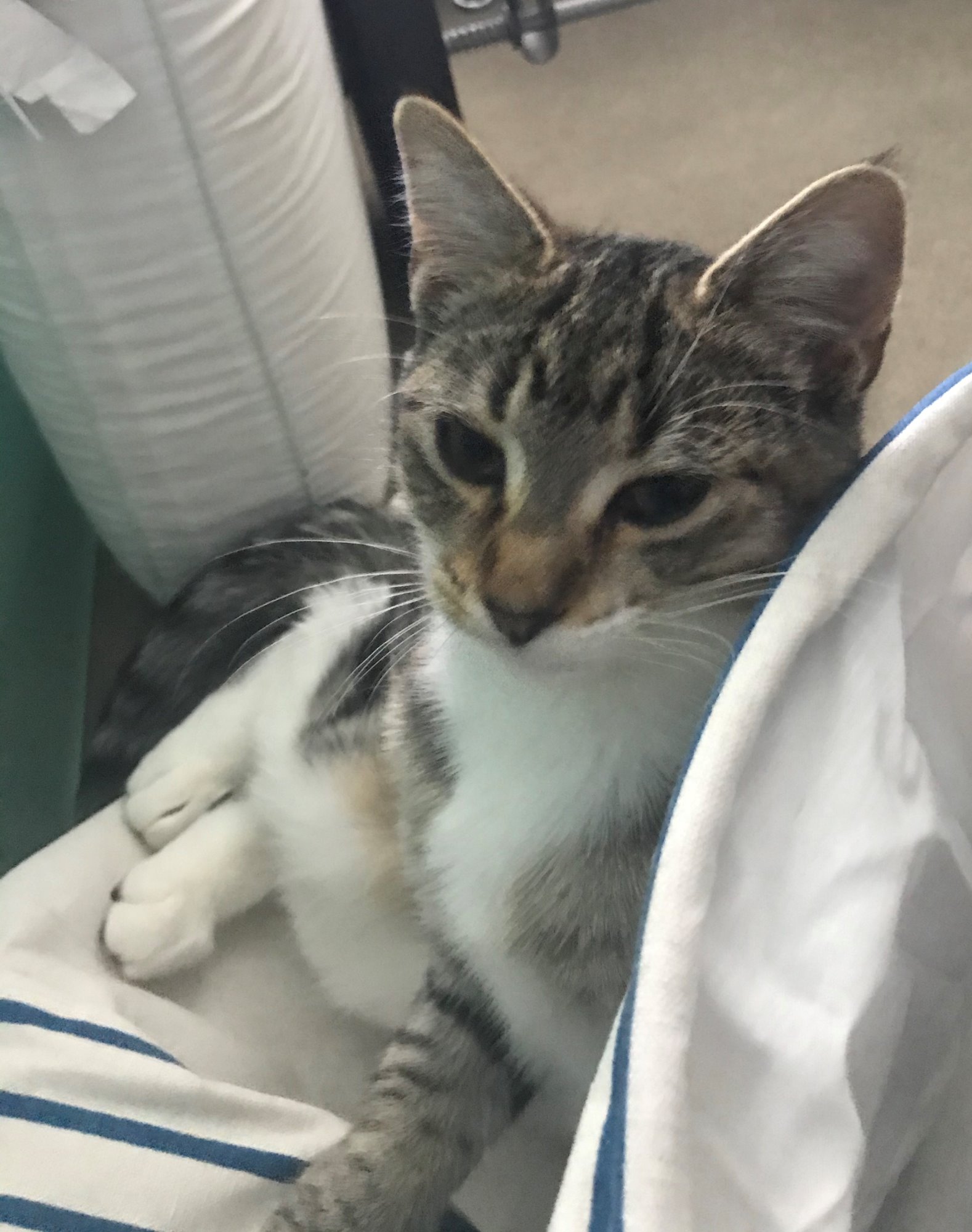 Libby, a beautiful Tabby and white girl, with little white paws, is a very sweet, purring machine! It took her a nanosecond to settle in, and she also loves to play and, of course, then take long cat naps afterwards.