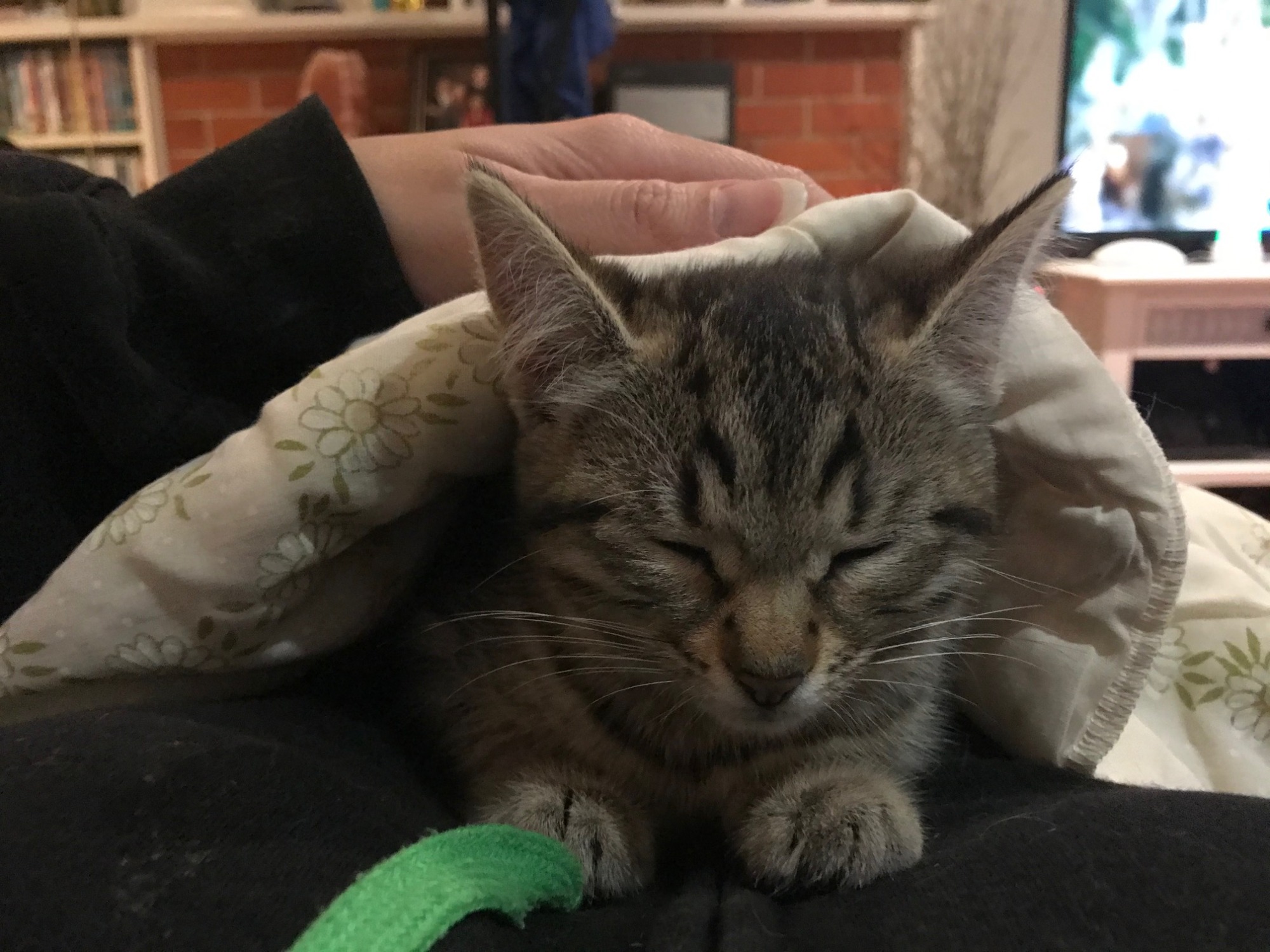 I am a sweet and cuddly girl who loves to sleep on the bed to keep you company. I am great with cats and kittens of all ages. I would love a lap to curl up in. I am not good with dogs, but I love to play with my 2 sisters and the older foster cats. I would love human or feline company. Most of all, I love to play!!