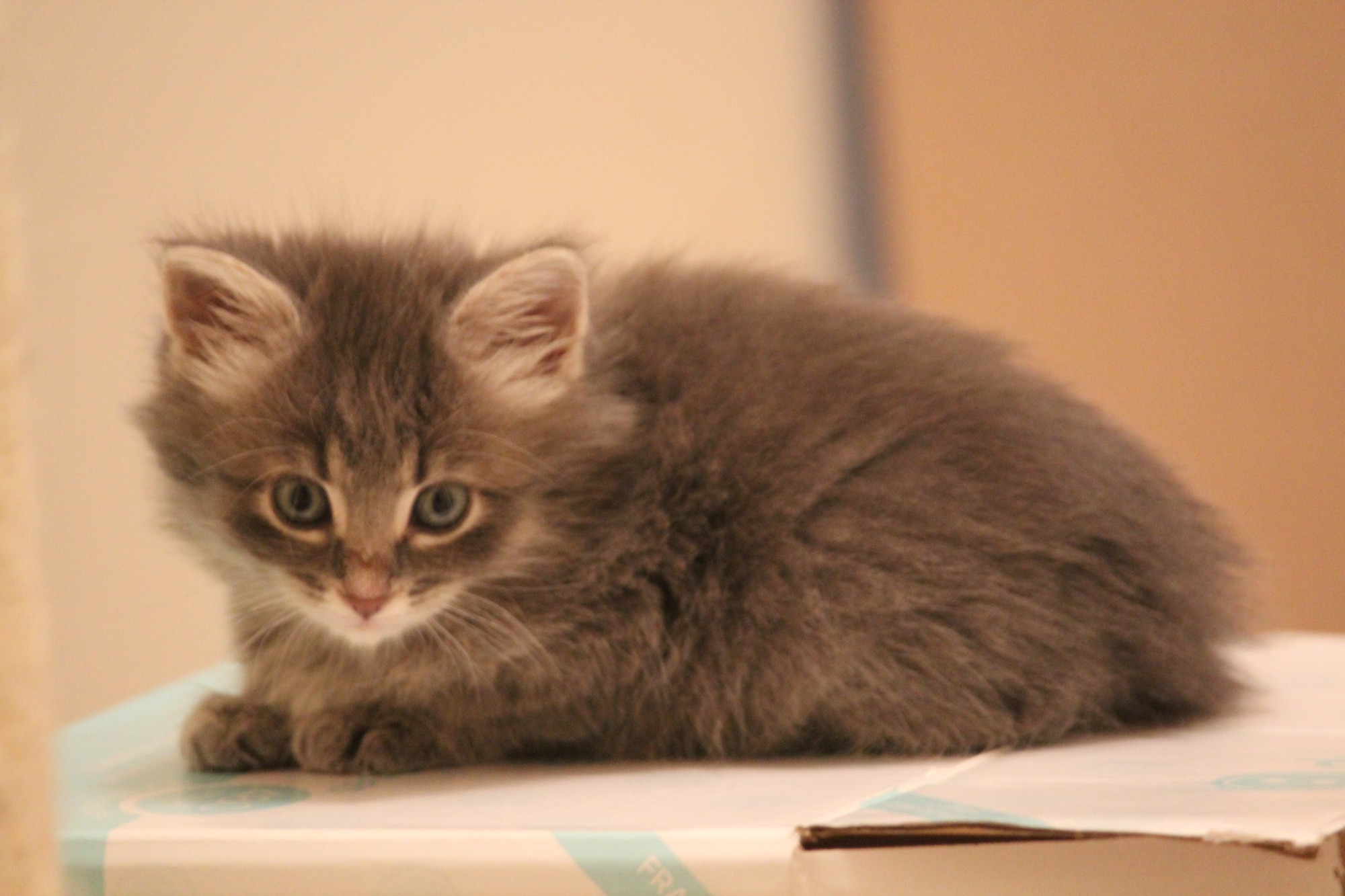 Cashmere is a beautiful fluffy grey girl. She is playful, very affectionate. She loves lap time and snuggles. Cashmere is toilet trained, and eating dry food, she'll be ready once her vet works in completed possibly end of May-early June.