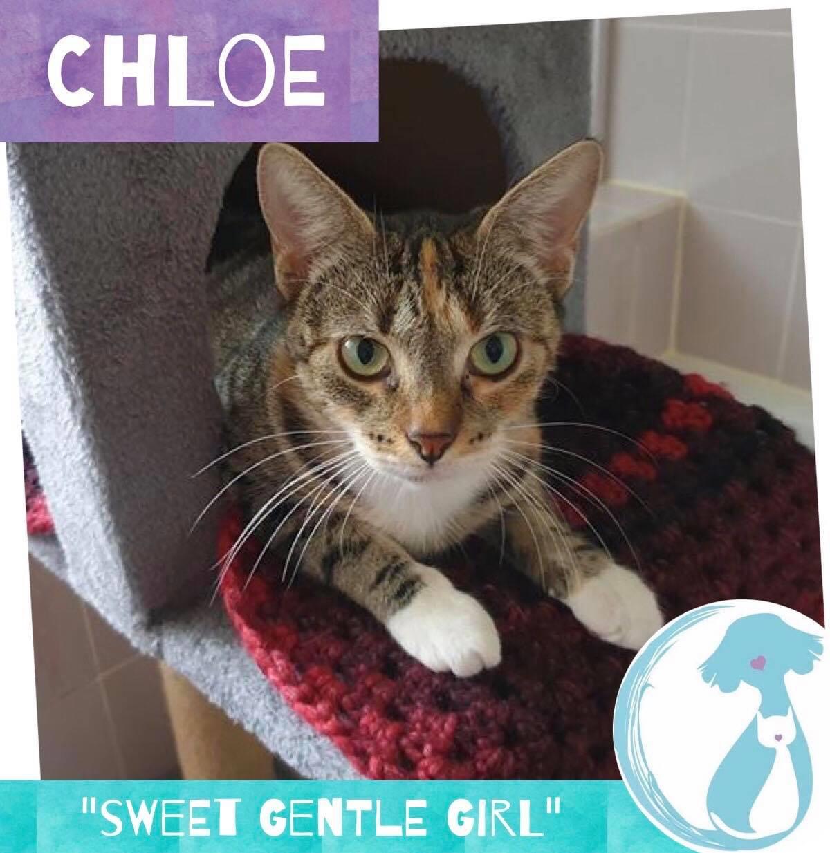 Chloe can be quite timid and nervous at first, but with time, patience, and lots of gentle scratches under her chin, she will learn that you are safe and that's when her beautiful personality comes out. She isn't a huge fan of being picked up but she definitely loves scratches and pats and will move her head from side to side to show you exactly where she wants you to scratch next. She also loves to play and pounces on her toys when she thinks they aren't looking.
