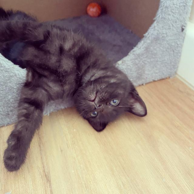 Meet little Strippy Zippy - a little black kitten with subtle stripes who came in all alone. We attached him to mum cat vannah and she has cared for as one of her own. a sweet little kitten who's keen on adventures and exploring his surrounds.