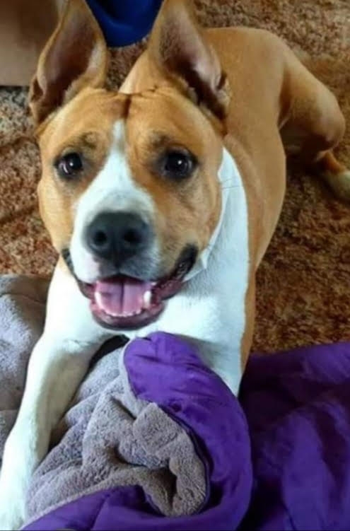 This girl is Izzy, a Staffy cross Bulldog, two and a half years old. She loves all humans and loves being with her people so much.