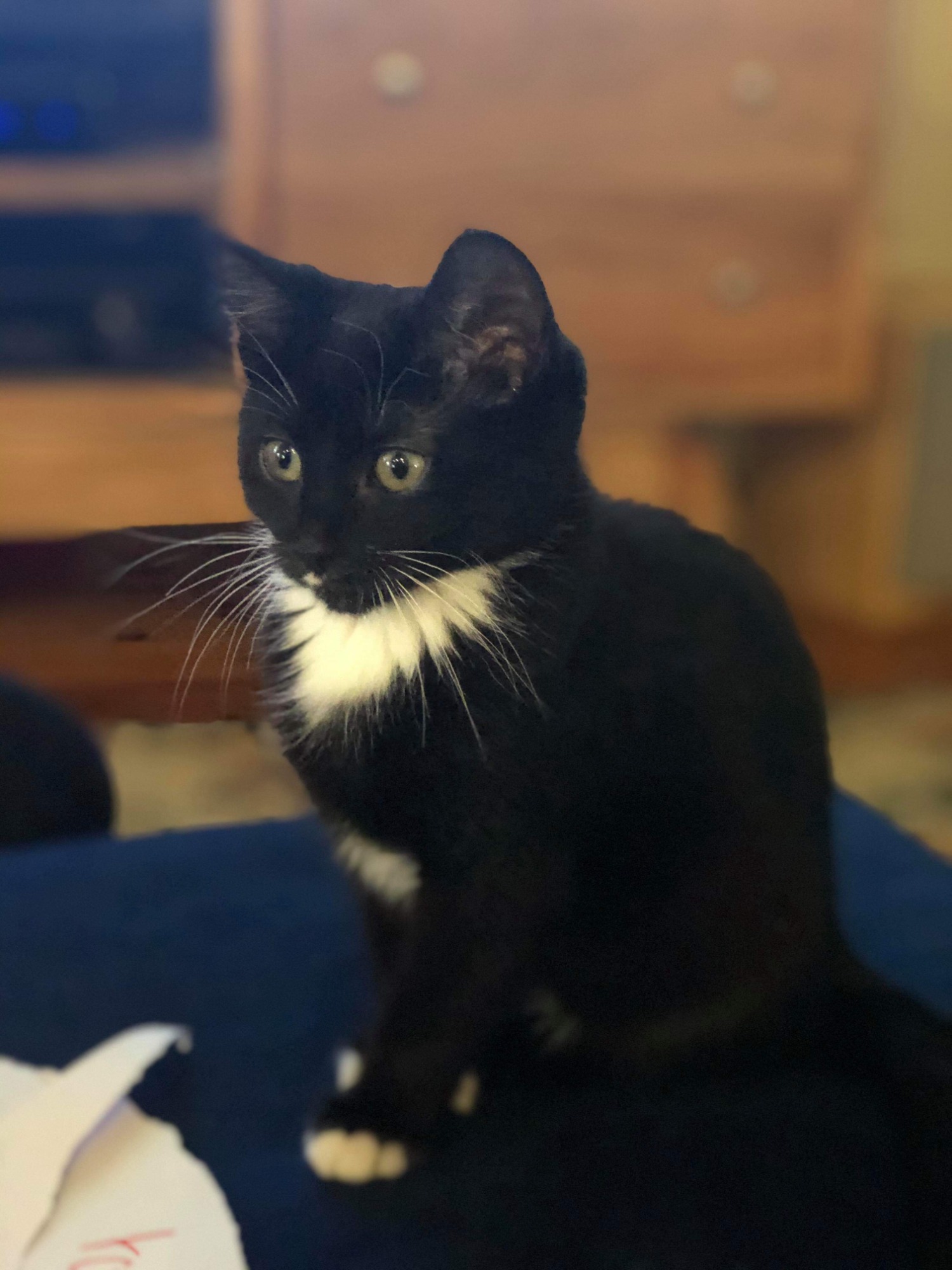 Look out it’s the Zoom Meeting Superstar. Esme is a constant presence on my shoulder, lap or draped around my neck and is very popular with my colleagues. She struts around the house confidently with a huge amount of sass. Her coat is silky smooth. She’s quiet and fine with kids and other cats.