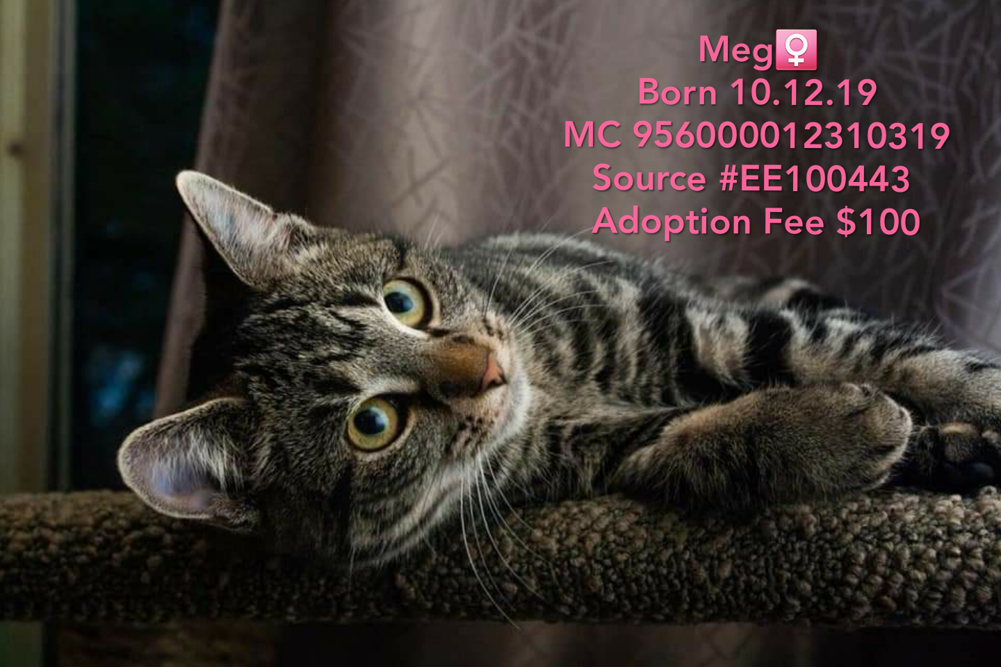 Meg is cute,charming and adorable.She loves human contact and another cat friendly pet to play with.
