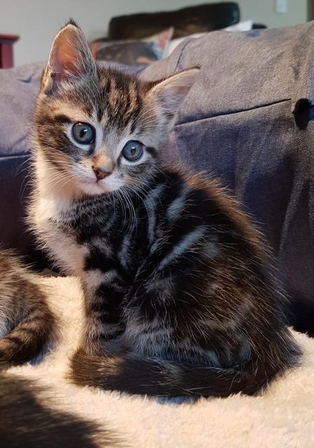 Gorgeous golden tabby boy found in a shed with 2 siblings, Bondi and Rae. Cheeky and cute - this little boy is hard to resist when he cries for cuddles and to be picked up. In foster care with older resident cats and small indoor dog.