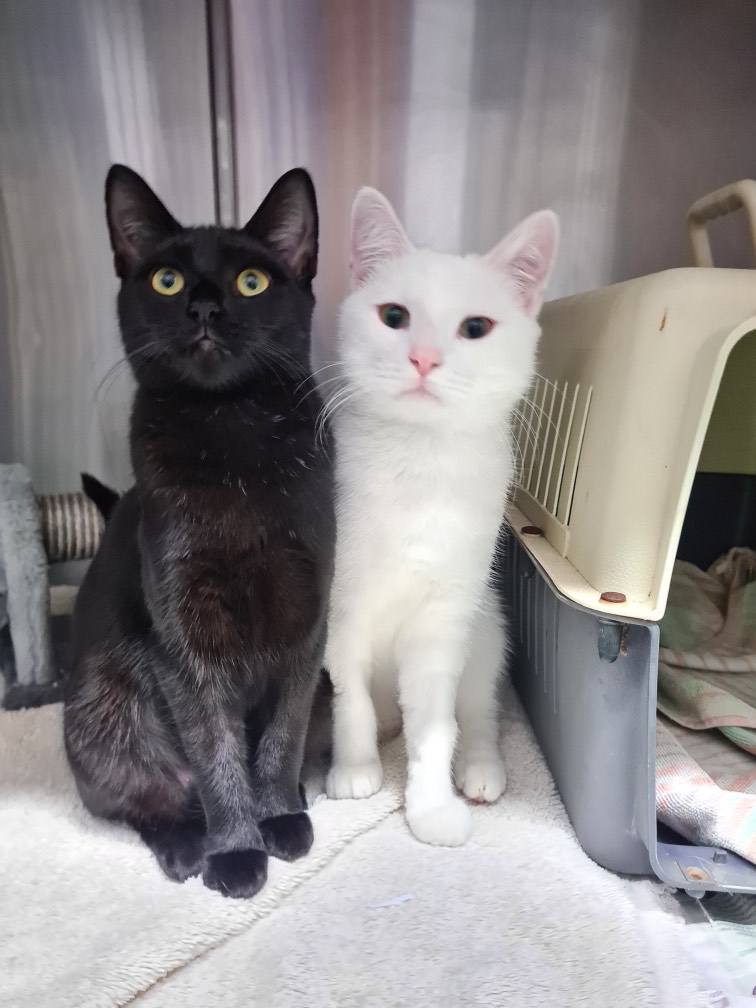 Hi! Our names are Titan (White male) & Arena (Black female)! We LOVE to lay around in the sun and keep to ourselves. We are quite and calm so don't require too much attention but would still love some pats when you can spare the time :)