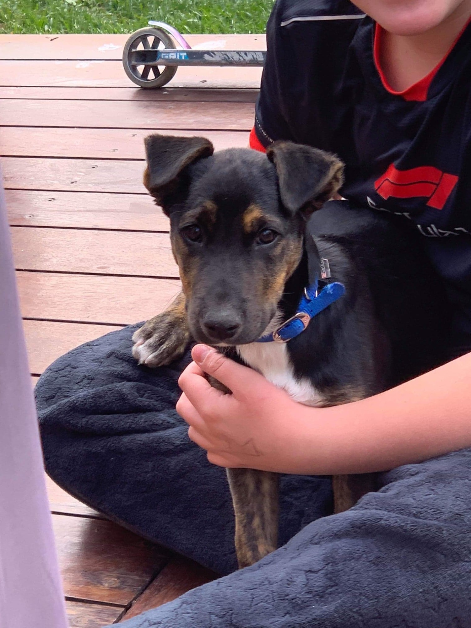 Lochie is very playful and loves having another dog around to run and play with. He also loves toys and balls and is learning fetch (so far he is more interested in chasing ball and playing with it than returning it but he is improving) He is doing well with lead training in the yard and is really keen to be able to go for walks in the big wide exciting world. He is a clever boy and loves to please, being food orientated he learns quickly for treats. He knows how to sit, lay down, go to his bed, go outside, and wait for food. Lochie is also crate trained for night sleeps and is doing well with his toilet training. A typical puppy, he is active and playful for a time and then enjoys a nap for an hour or so before he is up and ready to go again.