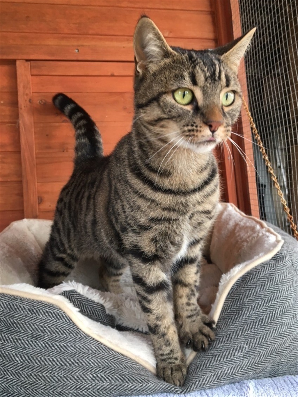 APRIL #123C is a one year old female tabby ready to be adopted now. She has already had a litter of kittens and was adopted a month ago along with one of her male kittens, by a family with young children, who all loved her and the kitten. However as the male kitten got older and bigger the two started to spat and sadly the family has had to return April to her carer. The family also feels that the hustle and bustle of a noisy family, while suiting the more outgoing male kitten to a tee, did not suit April's temperament. These suspicions have been confirmed as now she has settled back with her carer, she is a sweet and affectionate little cat who thrives on lots of pats and being in the company of a couple of quiet adults.