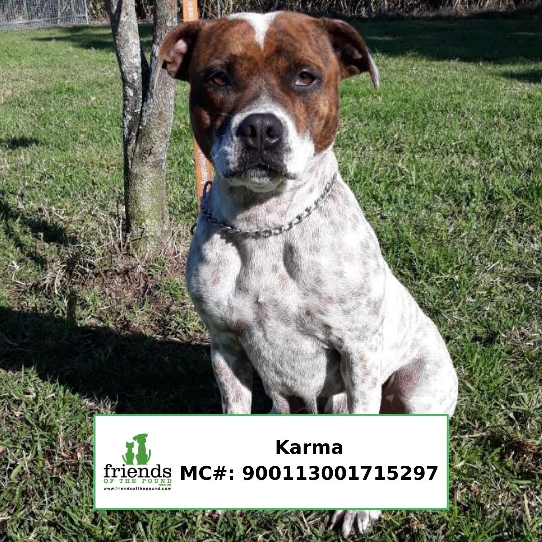 KARMA loves people and has grown up with children. She has a typical staffy nature and loves company and being part of the family. She is best as the only dog as she would like her owner(s) all to herself!