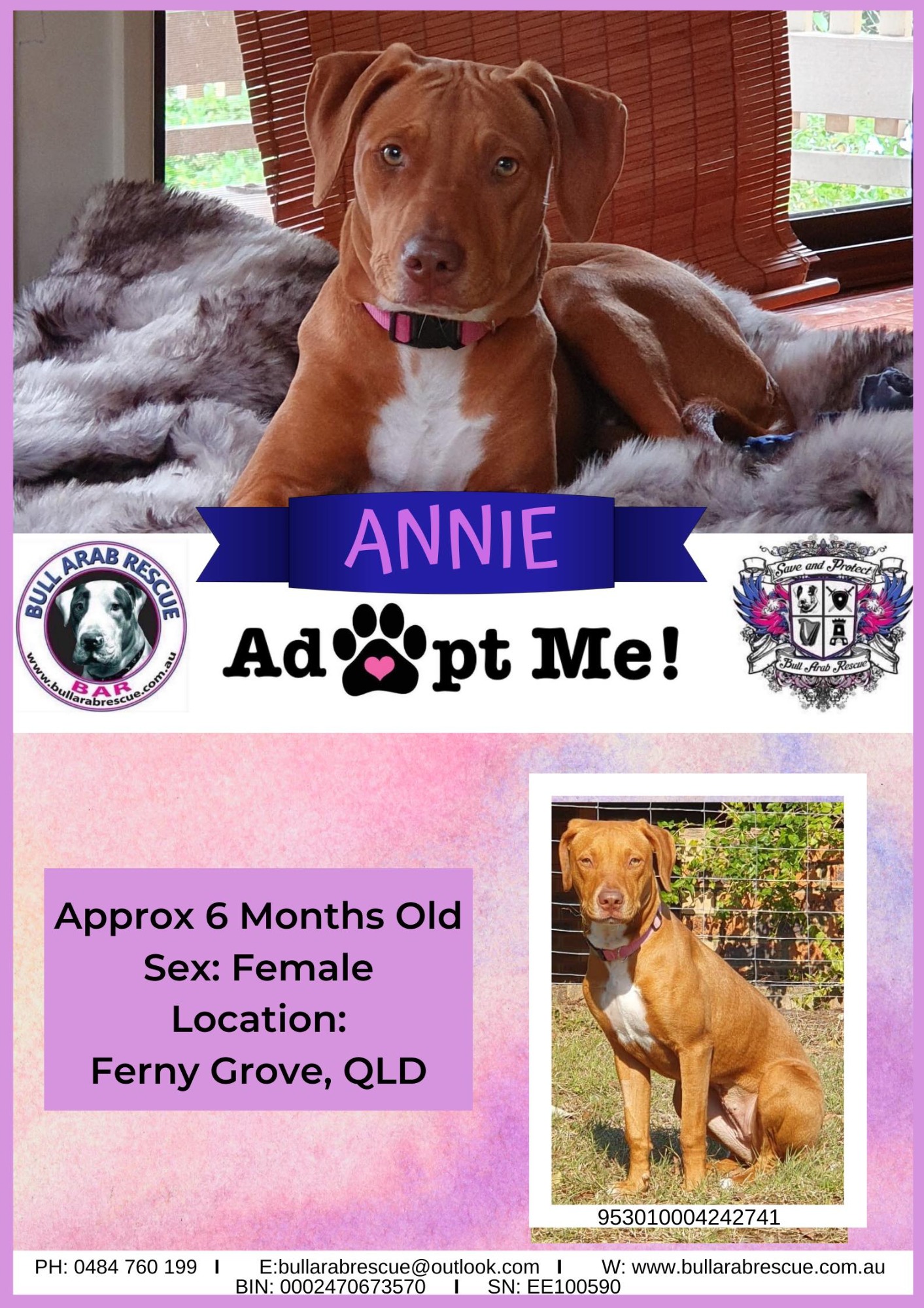 Annie is a sensitive girl. She has had limited human interaction and requires a special home, that can take the time to ensure she feels safe, to learn that humans are not scary and a family that will work with her to build her confidence.