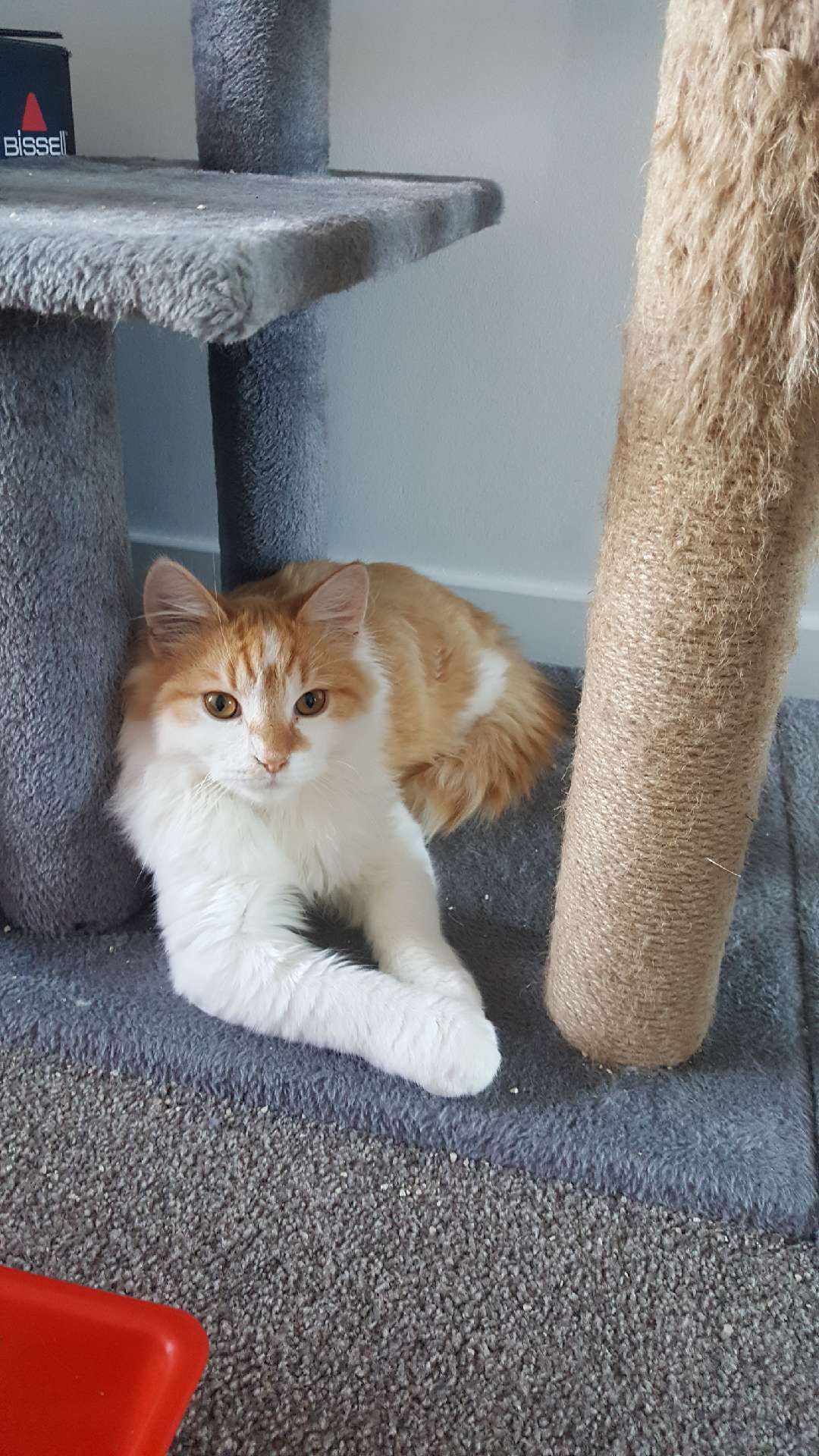 He’s a friendly, happy boy who loves his siblings and playing though he’d rather climb on your lap. He’s the most laid back of the litter.