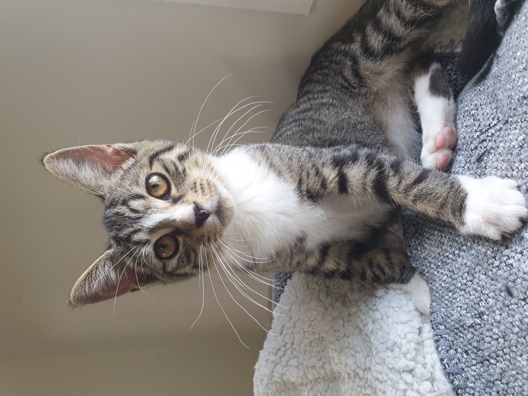 Elliot was also born with very mild Hemivertebrae, which is where his spine between his shoulder blades dips downwards a bit more than normal. He has a very mild case of this condition, and isn't expected to cause him and issues as he grows. And because everything comes in 3's, little Elliot was also born with "Pectus Excavatum" which can be known as "Flat Chested Syndrome". As a baby his chest was very flat underneath his body, and gave him a bit of a "flat pancake appearance". Luckily for little Elliot - with daily physio, correct bedding, and watching his positioning when he slept and ate has meant that his chest has almost normalised, and he doesn't require surgical treatment. Elliot has a slightly different body shape due to these skeletal deformities, his tummy sits a bit further away from his chest than a normal kitten, which gives him a bit of a pot bellied appearance (especially after a big meal). He also has slightly less room for his lungs than a normal kitten would.