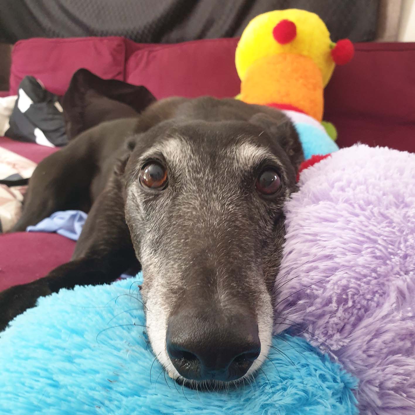 Hi everyone! My name is Star and I am a 9-year-old black and white Greyhound. I am the sweetest girl you could ever meet who loves nothing more than naps, leisurely walks and cuddles.