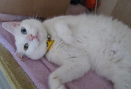 Angel, like her sister, toaster, is affectionate, intelligent and extremely good looking having one green eye and one blue eye. She is a quiet homebody who spends most of her time sleeping though she is also happy to play with her sister and spend time outdoors where she takes an interest in everything. She also likes to be close to you. Will need protection from the sun. If you are interested in adopting angel please ring marilyn 044 837 5983 or andrea 0466 428 316 and leave a message