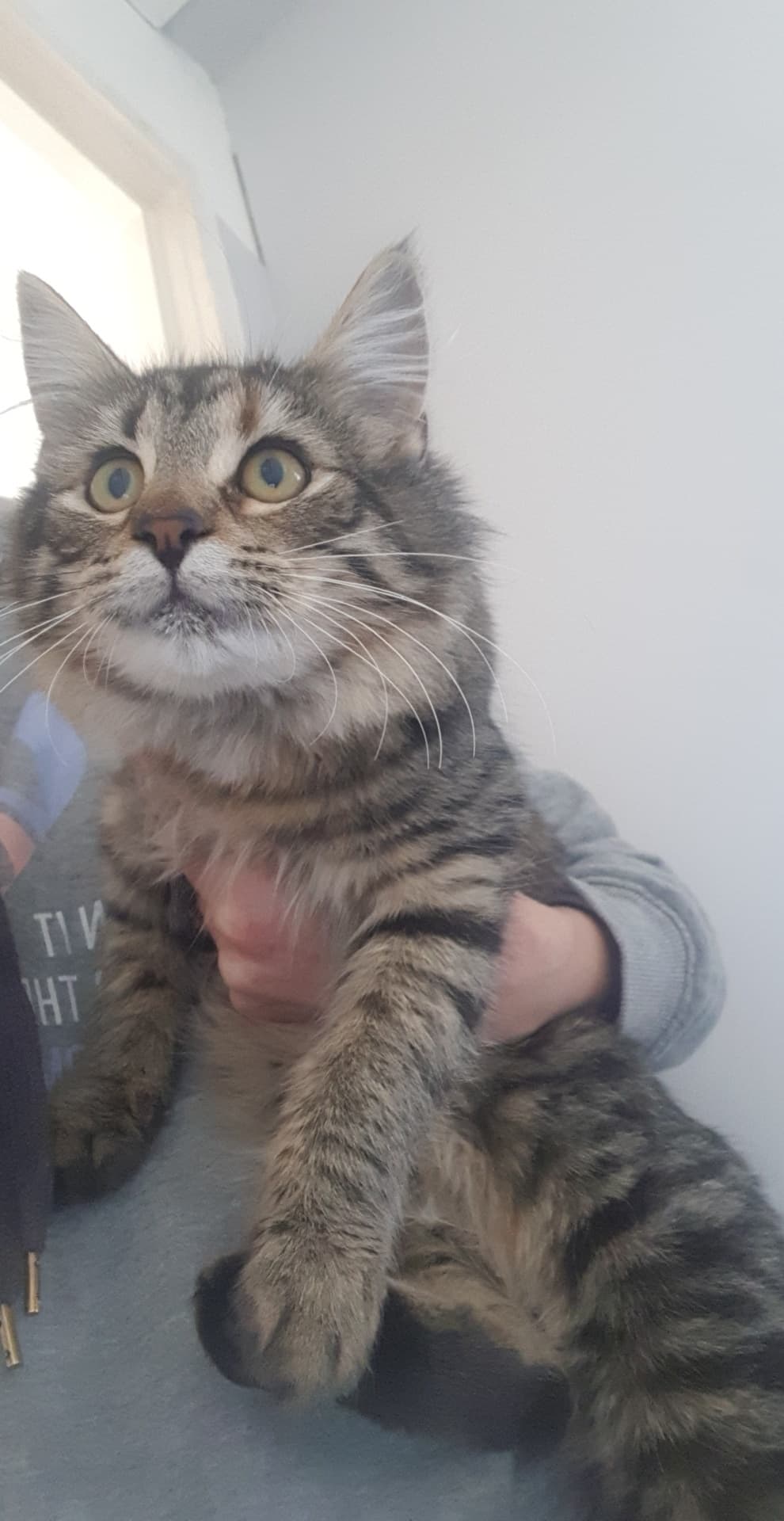 Evie is approx 6-7 months old medium haired tabby girl. Evie and her sister Eden were trapped as strays at a young age and rehabilitated in foster care and are now ready for their forever homes! Evie is the more adventurous girl and loves to play.
