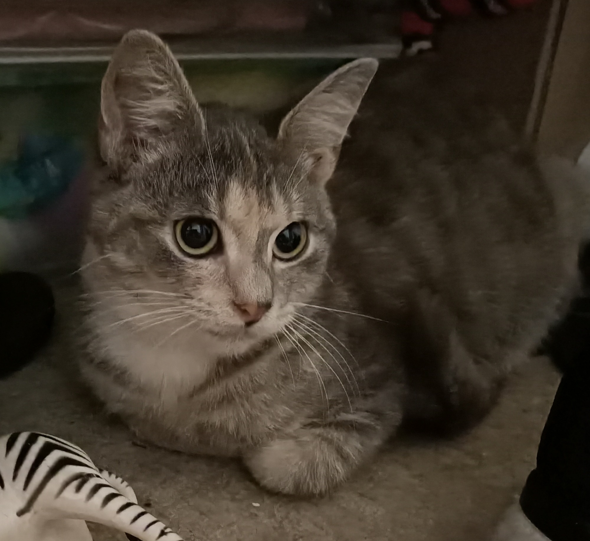 Very cute, playful kitten. She loves both adults and children, other cats and toys.