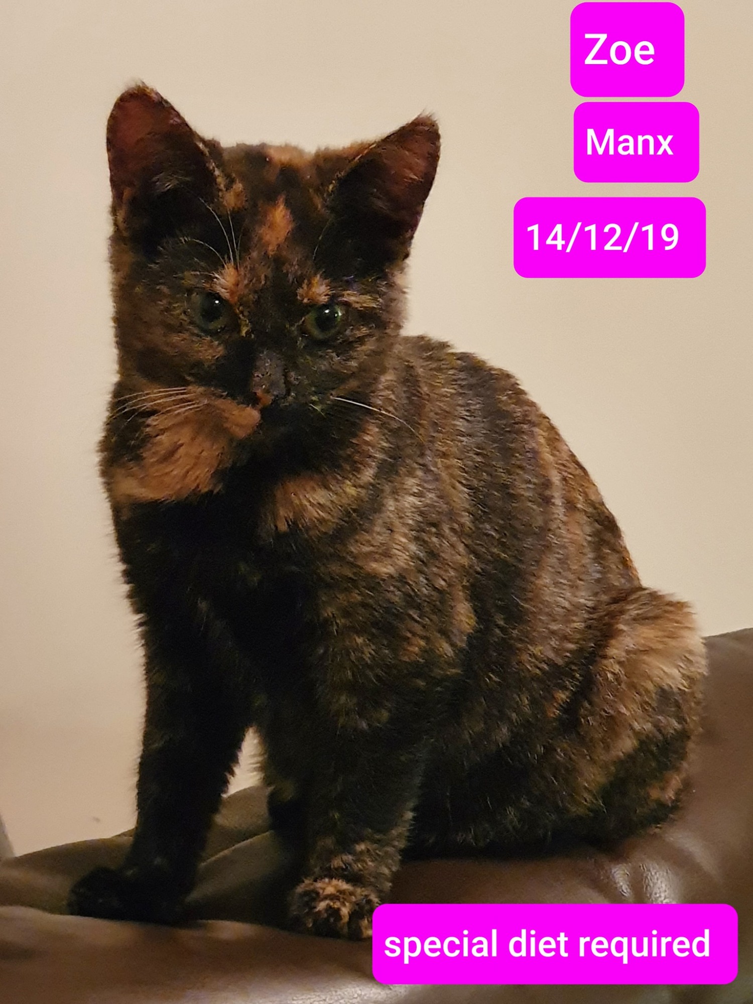 Time has come to start the journey of finding the right home for this quirky, beautiful and one of a kind girl. Zoe has the most amazing soft fur and a short manx style tail.