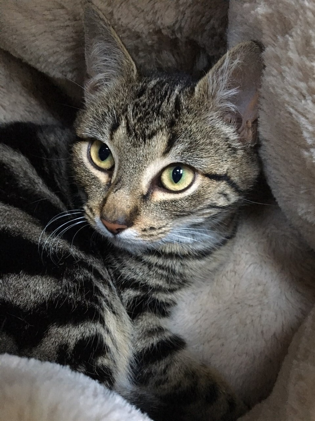 It appears that NONI # 139C was abandoned as a kitten and had to fend for herself in the bush for months before coming into care. Consequently she is very nervy and not at all comfortable with noises and strangers at this stage. She very soon learnt to begin to trust her carer though, and now allows herself to be patted and shows her appreciation with lots and lots of purring. She has never bitten or scratched. She is in a cattery setting which probably doesn't allow her enough human contact time to be ready for adoption to a typical family and her carers do work and there are many other cats in this facility needing attention. So if there is anyone experienced in winning over kittens like Noni before she fully attaches to her carer, which we are confident she will in time, it may well be a better option for Noni to be adopted quite soon. This allows her to start to bond with a family exactly where she will live out her life, as it is generally difficult for cats like Noni to readily accept a new home once settled and bonded. Noni would probably not be suitable for a family of young children and would need to be housed in a cattery or in a house cage which AWL can provide for a transition period.