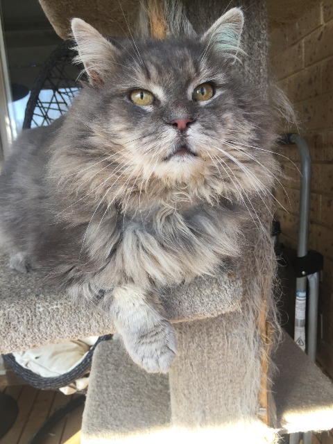 A big fluffy grey cat starting hanging around one of our foster carers house. He would stare in enviously at the cats living the inside life, and our foster carer, being a sensitive soul, started to feed him. She borrowed a trap and tried unsuccessfully for weeks to trap this darned cat, to no avail. One day he sat at the door letting out piteous little meows of hunger, so she propped open her screen door, put a lovely big plate of fishy cat food in the hallway and stood hidden behind the front door. Bold as brass, he wandered in and started eating, foster carer shut the front door and said ""gotcha!"" and he looked around, looked unimpressed with her cleverness and continued to eat the food then made himself right at home.