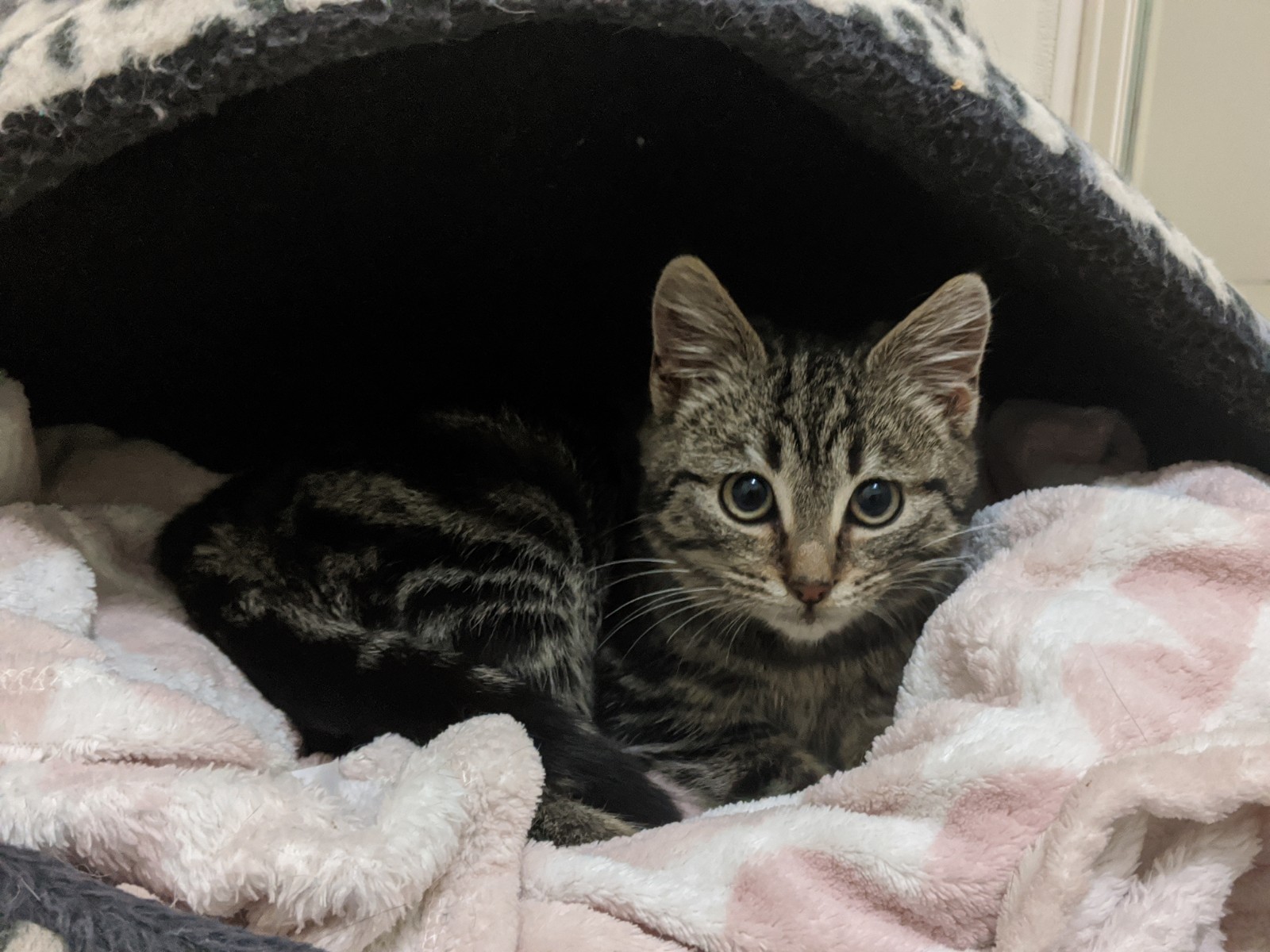 I'm quite timid, though I'm starting to come out of my shell, I've now started sleeping on mum's lap and even on the bed at night. I love soft blankets and will instantly start purring and kneading and making biscuits as soon as I land on one.