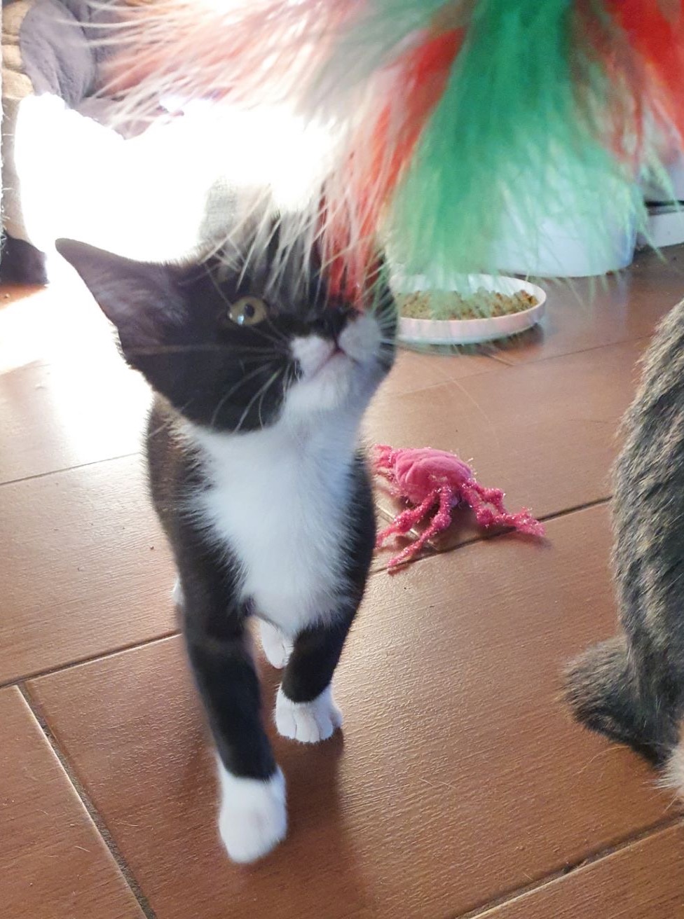 Still a young kitten Hugo’s personality is still developing and has gone through many iterations, from clingy, to independent, to somewhere in between but whatever his final adult personality will be his forever family will be getting a great kitten.