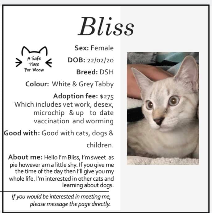 Name: Bliss DOB: 22.02.20 Sex: Female Breed: Domestic Short Hair Colour: White & Grey Tabby Adoption Fee: $275 which includes desex, microchip, first vaccination and up to date worming.