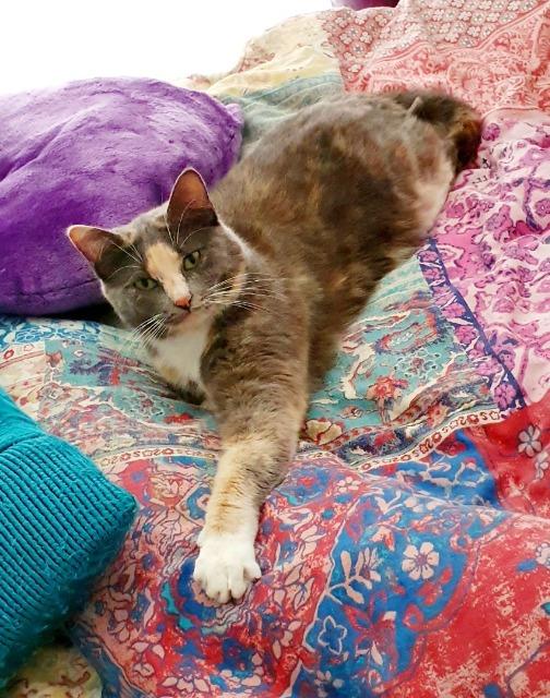 Shanti and her mother Pocahontas are looking for a home together! They are super bonded and we will only consider applications for them as a pair. Shanti is a soft, fluffy girl who can be shy but then seeks you out with her tail happy dancing behind her. She loves to play, and has shown herself to be a great hunter of feathers on a stick (such as the wonderful Da Bird toy), shoelaces, and flies! She will accept cuddles and belly rubs once she is comfortable with you, and has recently learned to enjoy being picked up. She is really learning to enjoy human attention, and it will be a joy for her forever humans to provide that for her.