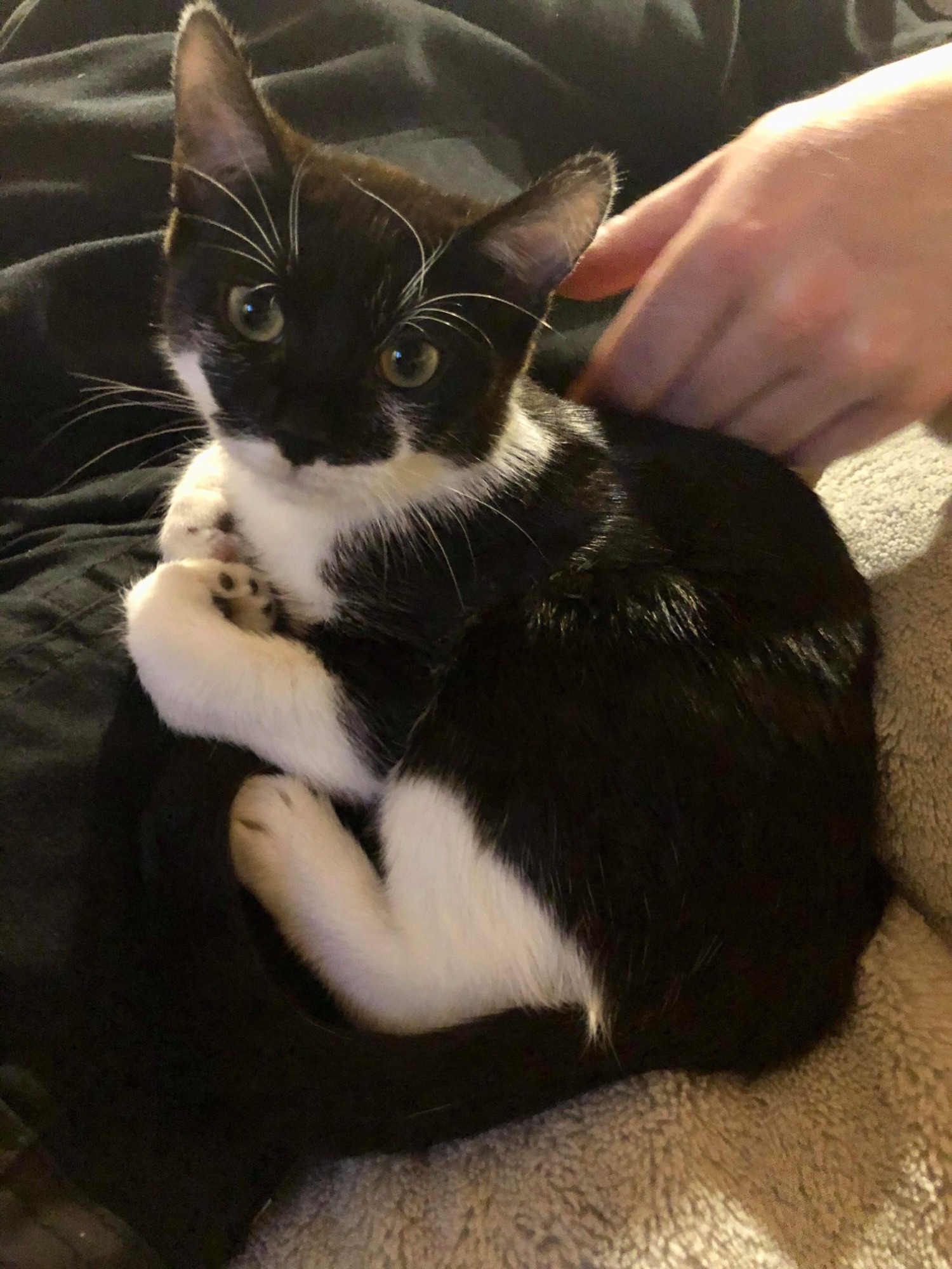 She’s still shy but very curious of humans. She will sit on your lap with scared eyes but will eventually relax. Instinctively she loves cuddles but she needs to overcome her distrust.