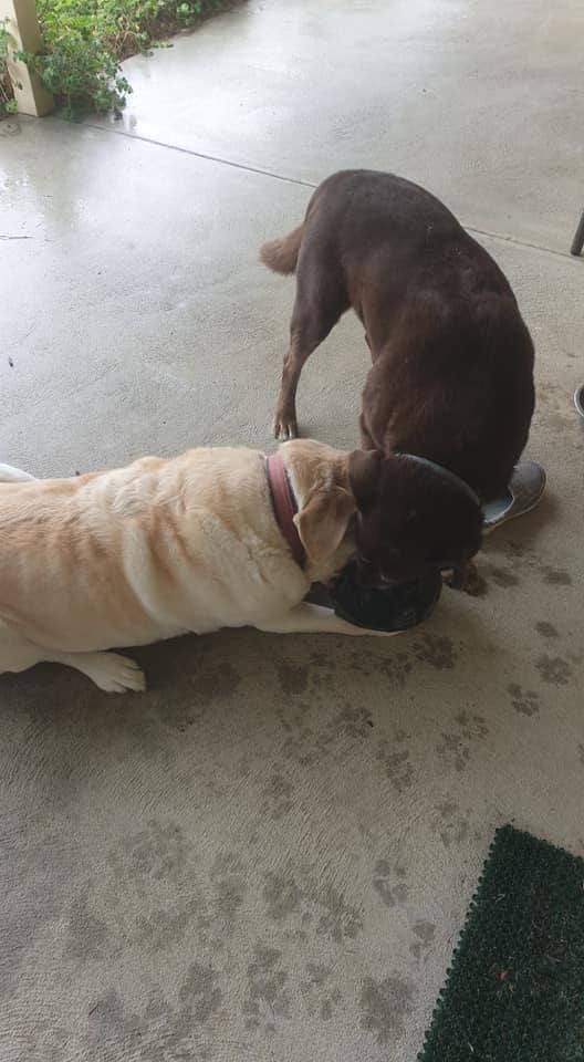Red is 14 and Bear is 15, but you'd be forgiven for assuming they are younger puppies as they are still active and love to play, especially with their football and soccer ball.