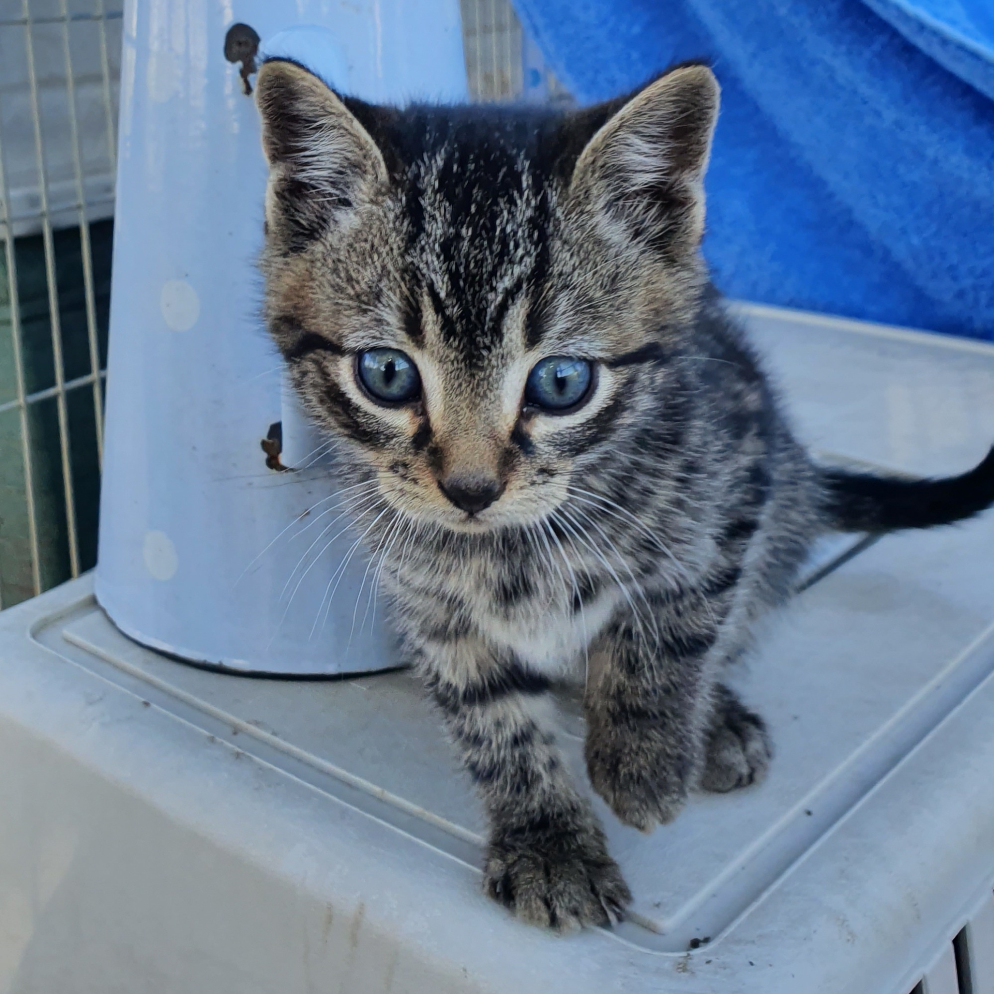 He has lovely brown tabby markings. His baby blue eyes are changing to a lovely green hazel.