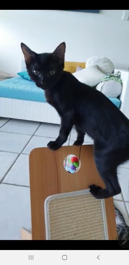 She is shy, she holds back, watches, comes and sits close to you. Makes delightful meows & purrs her heart out. Is highly food motivated. She is always interested in food. Food & cuddles makes Emerson a very happy kitten. Emerson gets along well with older cats.
