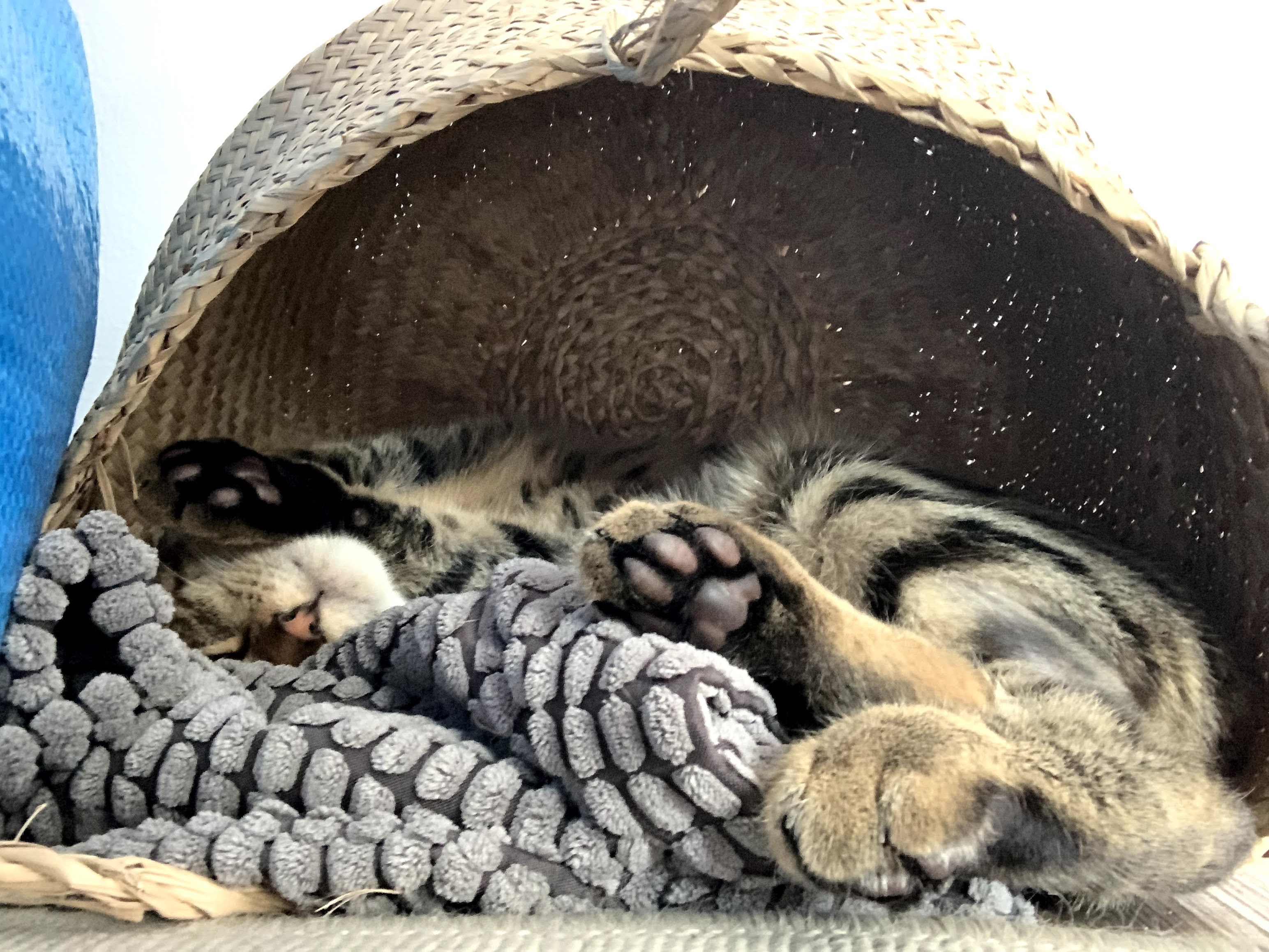 During the day Humbert likes to snooze in his basket, stirring himself now and again to check out what is going on. He likes to help his foster mum with her computer work (plonks himself on her laptop, blocking the screen and pressing all the keys until they beep). He will then curl up on his mum's lap or on the chair behind here and lie there all afternoon, slowly stretching out ..