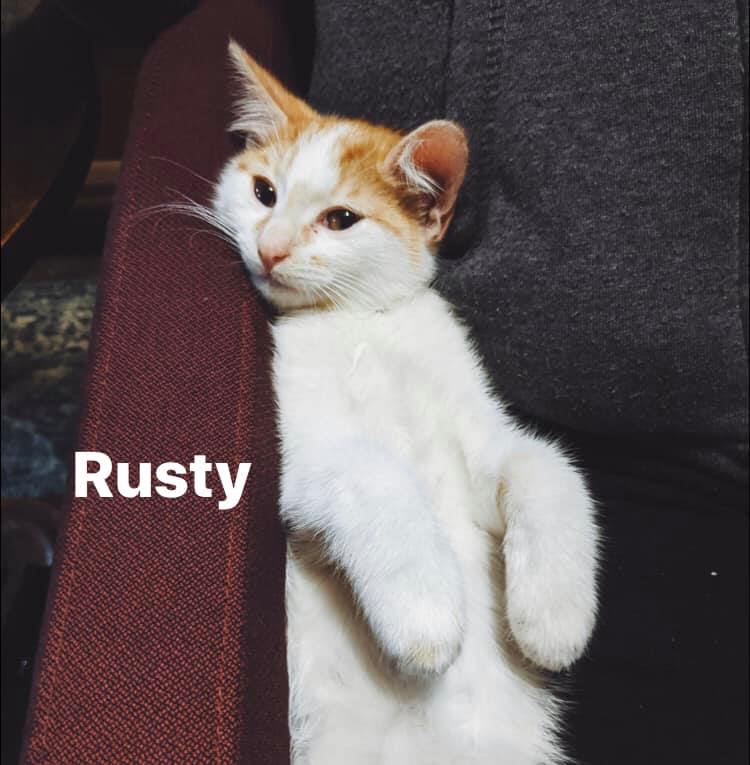 ABOUT ME: Hi I'm Rusty and I am a ginger and white cuddlemonster. I live with my siblings Fancy and Holden (also up for adoption) at my foster carers home. We were very small when we were all rescued and have now grown up to be big and strong. I am a typical kitten - love pats, cuddles, playing, humans and love.