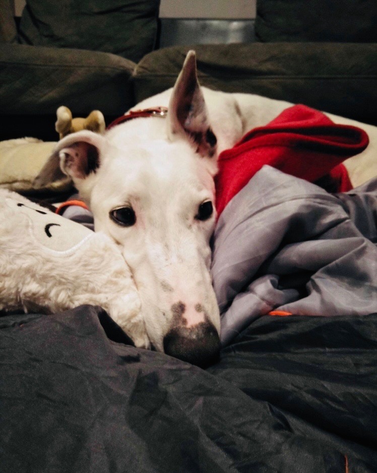 Despite this, Buddy is a very handsome and loving dog who charms everyone he meets. He’s a typical greyhound, very smoochy and loves to lie on his back for cuddles and kisses. He’s whip-smart and would respond well to training and learning new tricks. We think he will make his new owners very happy.