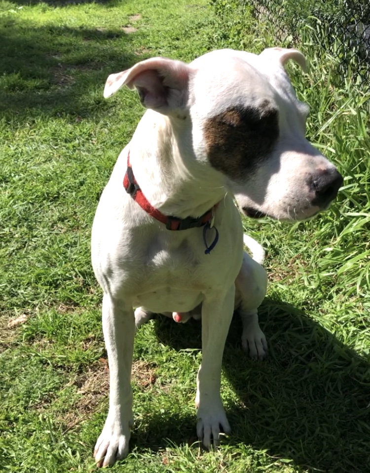 Boss to our best guess, is a Staffy cross. He is super lean, maybe due to stress and he has been gaining weight since being in foster care. This lovely boy lost his right eye as a puppy during a tiff with his mum. Only having one eye doesn’t slow him down at all - in fact you can barely tell. This boy gallops around the yard at speed !