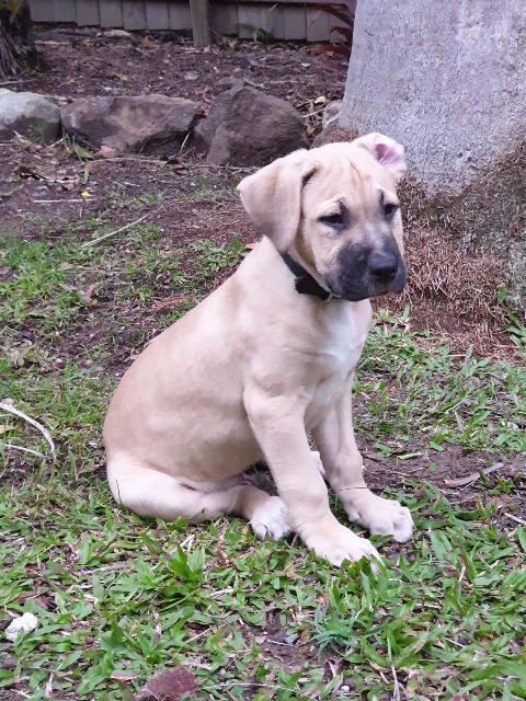 Rex is a happy chilled out boy and built like a truck. Rex has more rolls then a bakery and will grow to be a BIG boy. Rex loves his sleep and sleeps through the night in his crate with no complaints or mess. Rex loves playing with his siblings, is learning what chickens and cats are, and loves nothing more then foraging through the garden for sticks. Rex will need a committed family to help continue his training as he will be a large dog, this will help him grow into a well mannered Big Boy. He will require a large yard to run and owners prepared to put in the time with him with regular excercise and plenty of stimulation to avoid boredom.