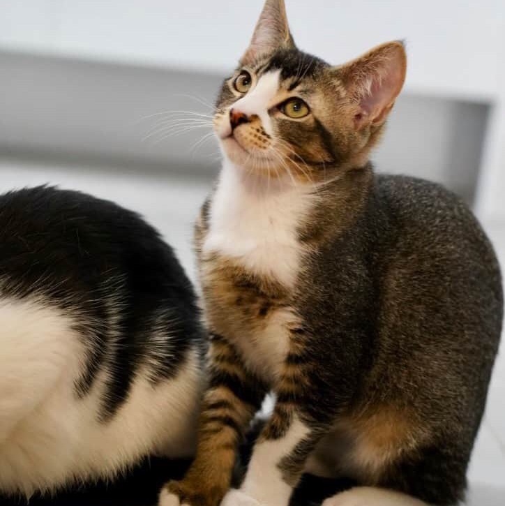 I am an energetic, mischievous and playful kitten. I love nothing more than discovering new places and playing with my brother! I am a beautifully marked cat with the softest striped fur. I was recused with my mum and brother after being found on the street. Due to this rough start to life I am still getting used to humans and may hiss when I feel threatened or scared. I would be best suited to a calm household where I have access to lots of toys and fun! I will also need a secluded place to rest where I feel safe and secure.