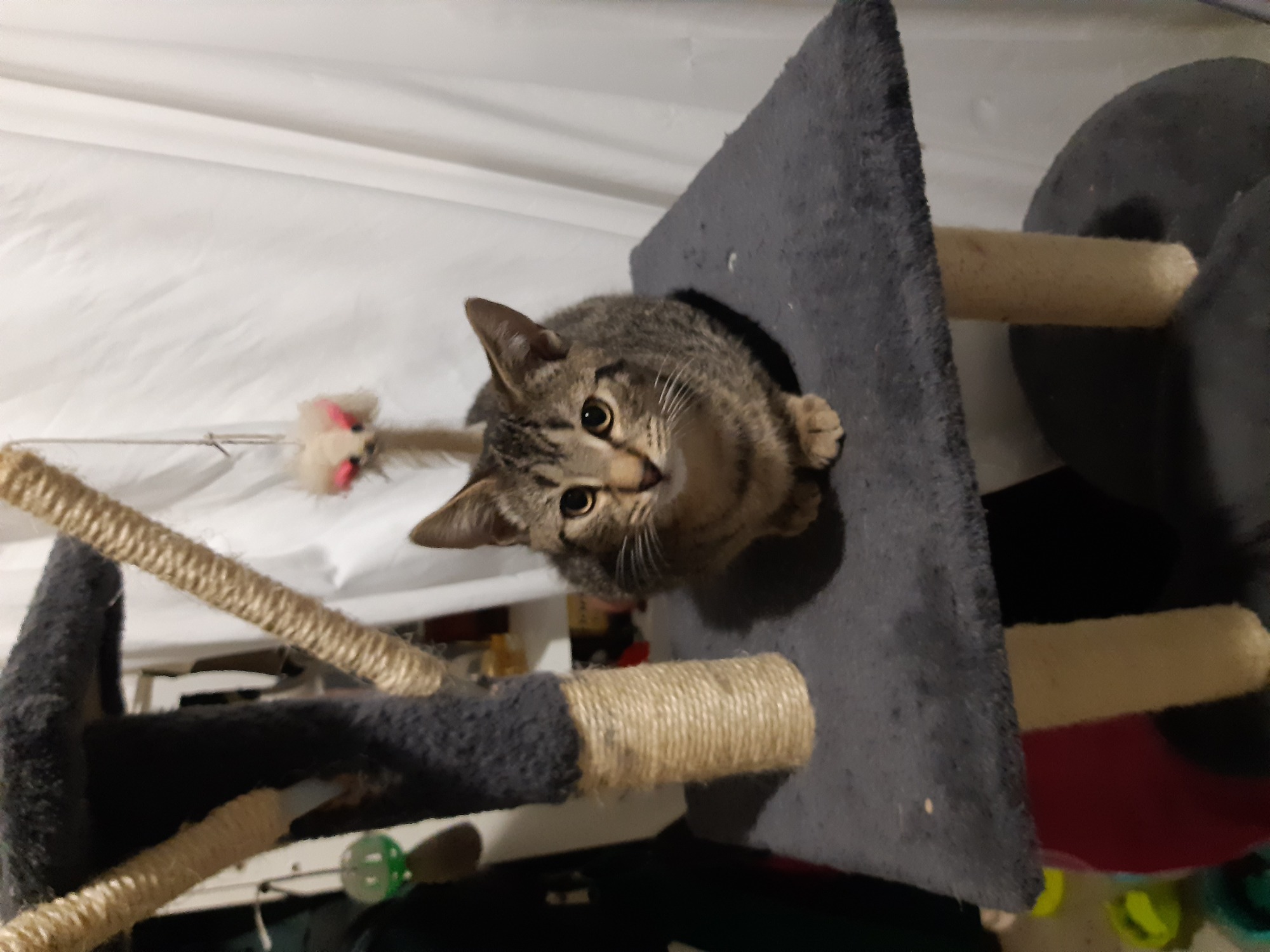 Tiger is one of three that came to us very shy and would not come out from hiding for over 3 weeks now he hates being on his own loves the human company. Sleeps on our bed very playful gets on well with other cats.