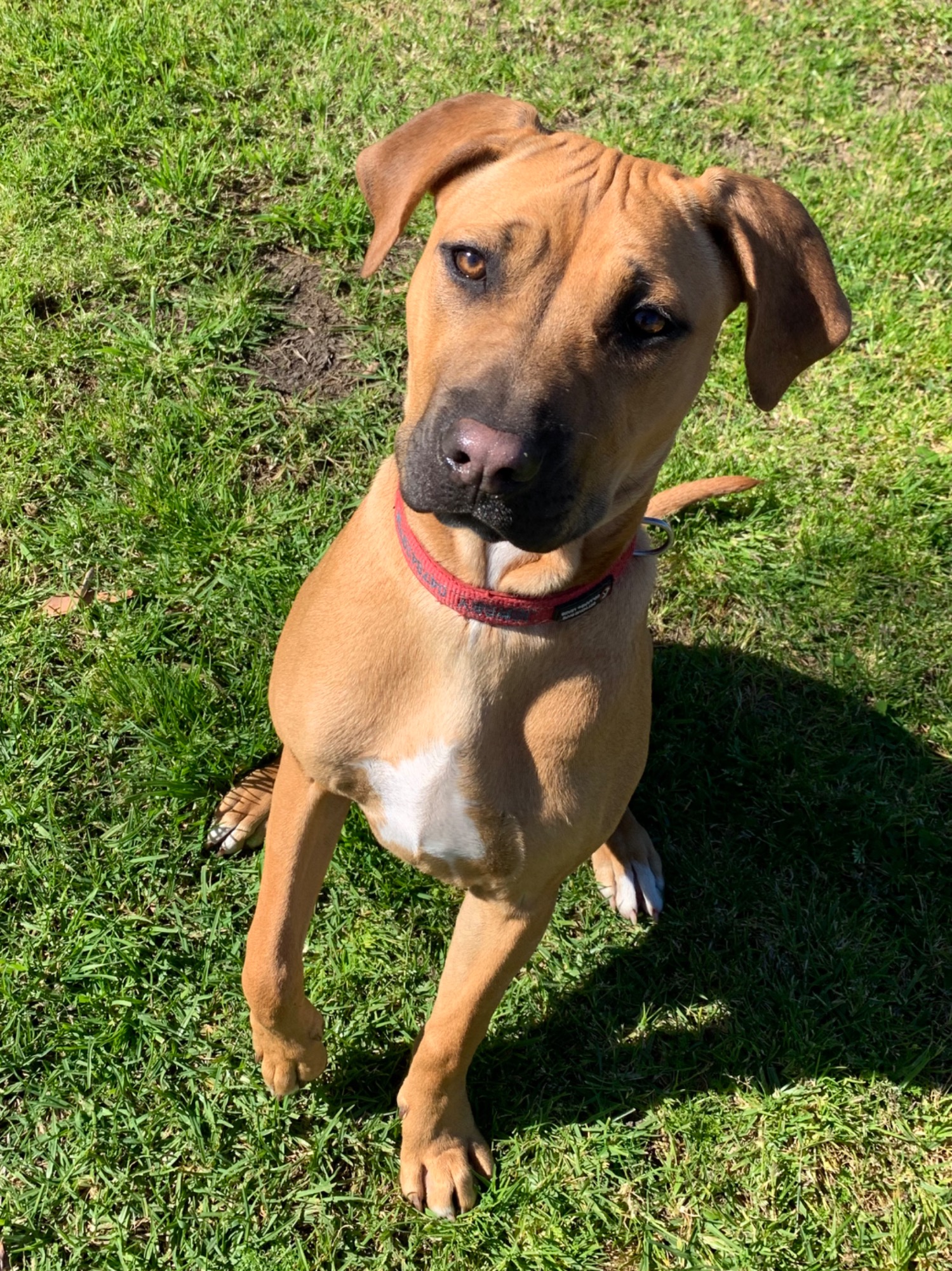 Isn't this girl a stunner! Although originally thought to be Staffy x, Jersey is looking more Rhodesian Ridgeback than anything....except when it comes to her size! She's currently a medium size dog (around Kelpie size).