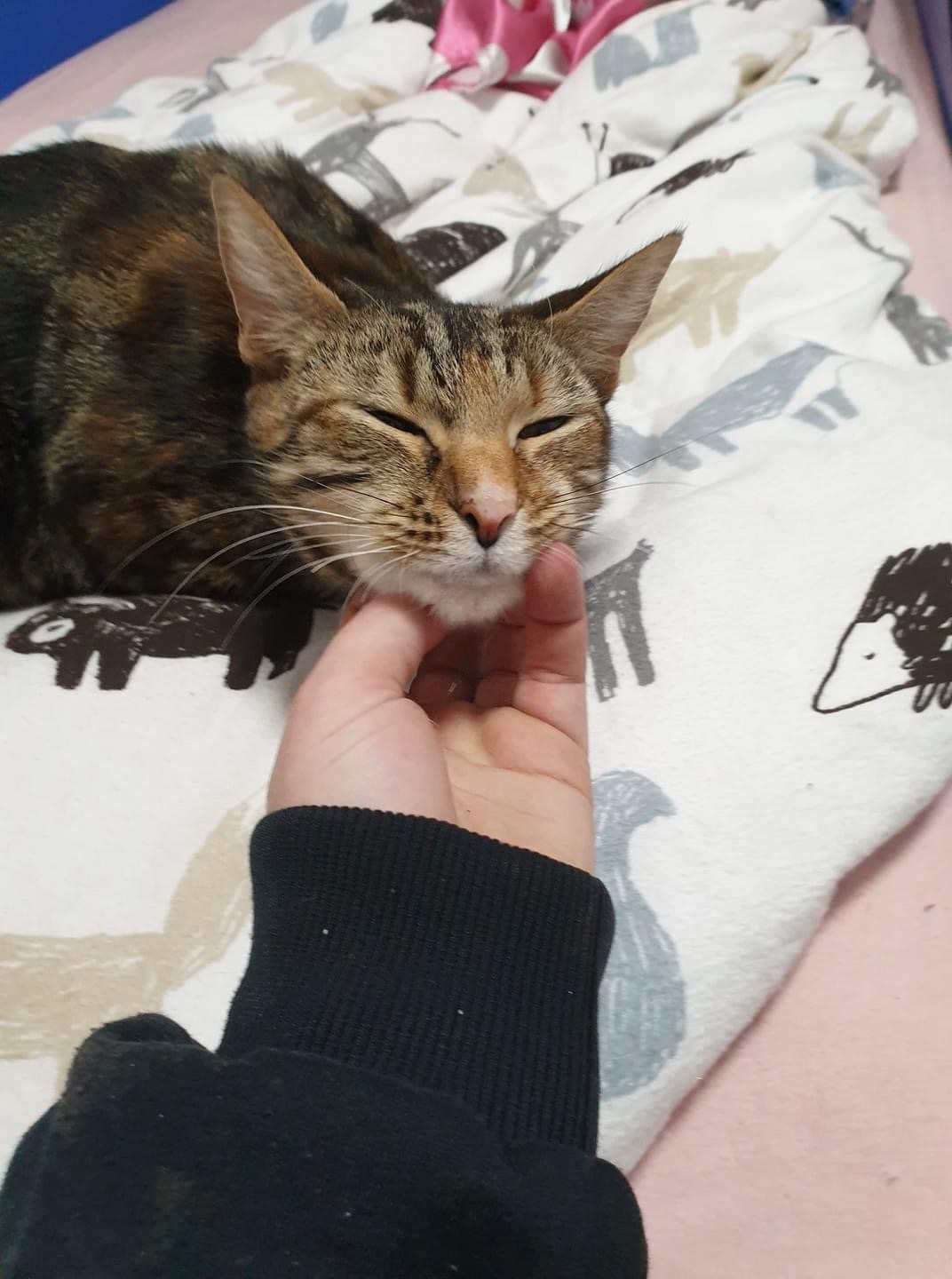 Eclipse came into care pregnant. She has now raised her babies and its time to find her forever family. She can be skittish but has slowly gotten use to my crazy household. She is not sure around dogs or loud over active children so a house with calmer kids where she can get all the love would allow her true personality to shine. She has slowly accepted my 2 male cats and now co-exist with the occasional nose kiss.