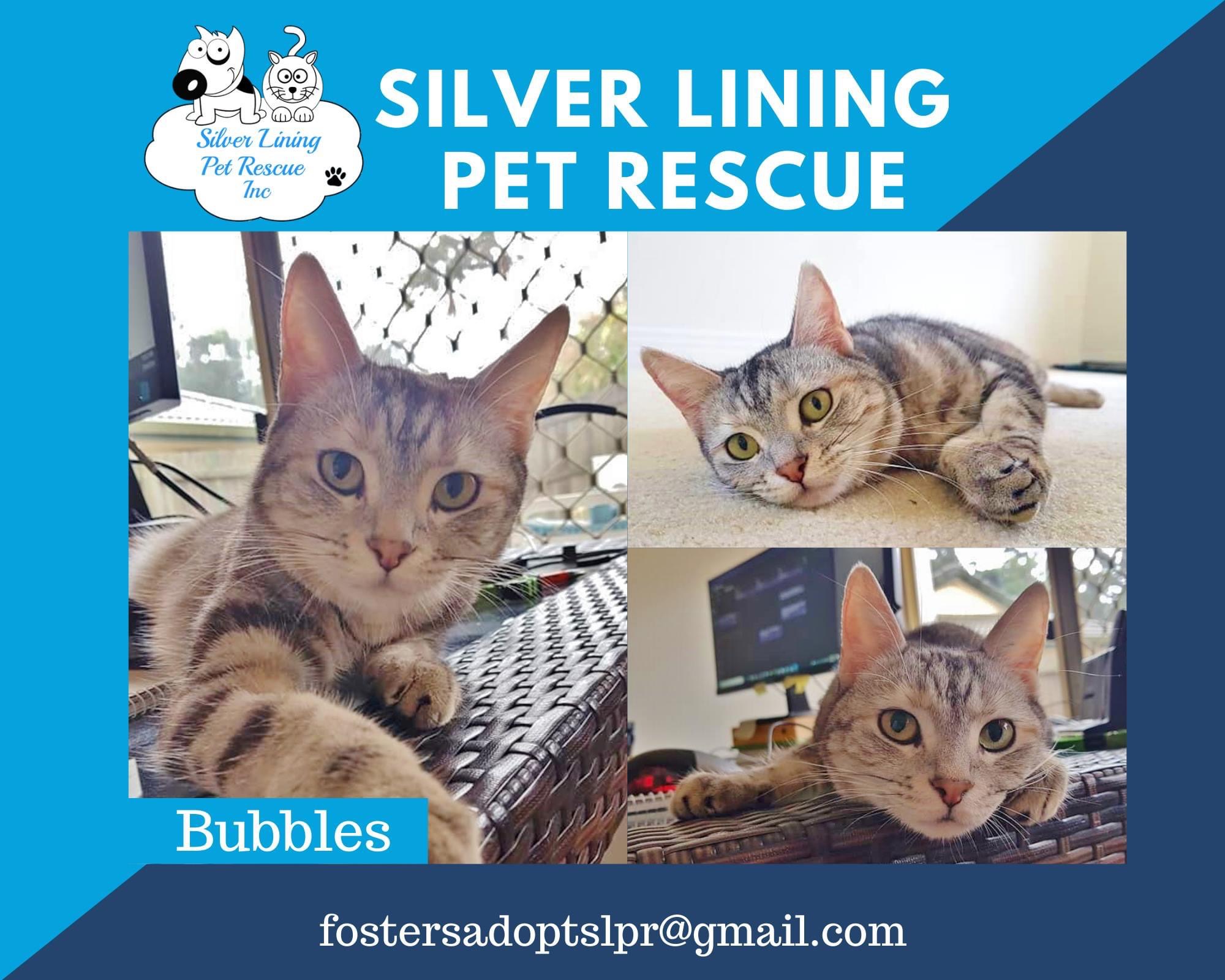 Hi there, my name is Bubbles and my foster mumma thinks I am the most beautiful girl! I am an affectionate girl who just loves her humans, pats and snuggles. I show you how much I love the snuggles and pats by stretching out and cuddling you with my paw.